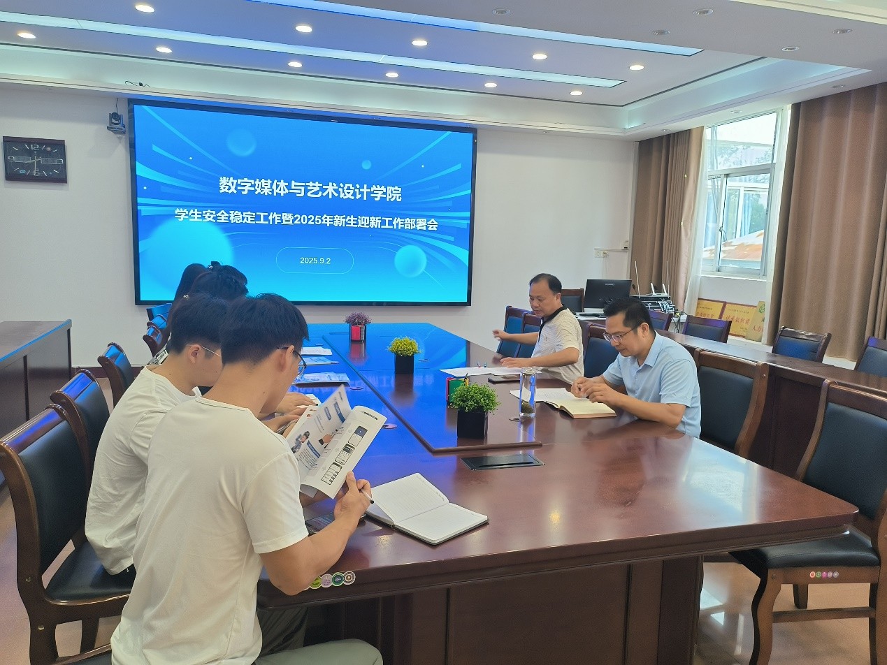 2025年9月2日上午,数字媒体与艺术设计学院在八教二楼小会议室召开学生安全稳定工作专题会议暨2025年新生迎新工作部署会。院党委书记丁伟、党委副书记汤中科及全体辅导员参会。