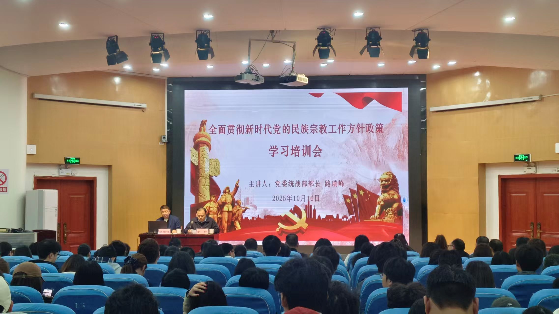 校党委统战部部长路瑞峰担任主讲人,他凭借深厚的理论功底和丰富的实践经验,从当代中国的宗教与宗教问题、宗教工作的重要性、中国共产党的宗教工作基本方针、习近平总书记关于宗教工作的重要论述以及如何全面贯彻新时代党的民族宗教工作方针政策等五个方面,深入浅出地解读了新时代党的民族宗教工作方针政策。从政策的历史背景到当下的实践要求,从宏观的理论框架到具体的案例分析,路部长用生动的语言和鲜活的事例,让抽象的政策变得通俗易懂,使在场师生对民族宗教工作有了更为全面、深入的认识。