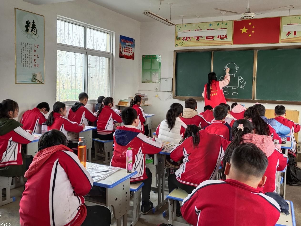 首先,教师党员代表为学生们发放了100套绘画用具,并送上了亲切的慰问祝福,希望他们能够用心感受生活中的美好,用多姿多彩的画笔丰富日常的学习生活。绘画教学正式开始前,学生党员志愿者先与孩子们进行了有趣的交流互动,激发他们的绘画热情,更是启发孩子们利用线条、形体、色彩等相结合来表现自己对周围事物的理解,表达内心的思想与情感。支教志愿者事先准备了许多憨态可掬的小动物照片,并向六年级一班的学生们传递了关爱动物、保护动物的观念,引导他们对身边的流浪猫狗奉献爱心。在寓教于乐的过程中,一只只可爱的小狗跃然纸上。在六年级二班支教的志愿者先是向学生们展示了很多充满科技元素的画作,让学生们深切感受到科技进步的神奇与魅力,然后又生动形象的讲述了几个关于机器人的小故事,最后板书讲解详细的机器人绘画步骤,耐心指导孩子们临摹,并鼓励大家自由发挥,充分开发想象力与创造力。