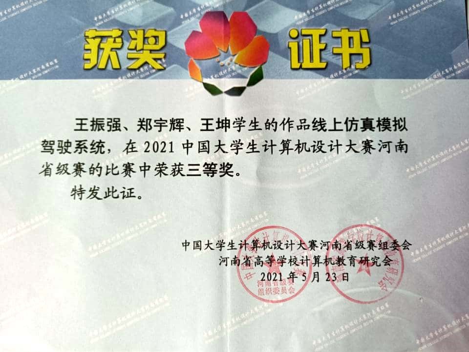 近日,2021年(第十四届)中国大学生计算机设计大赛河南省级赛在河南工业大学成功举办,我校数字媒体与艺术设计学院虚拟现实团队王振强、郑宇辉、王坤三名同学在比赛中表现优异,所开发作品“线上仿真模拟驾驶系统”荣获三等奖。
