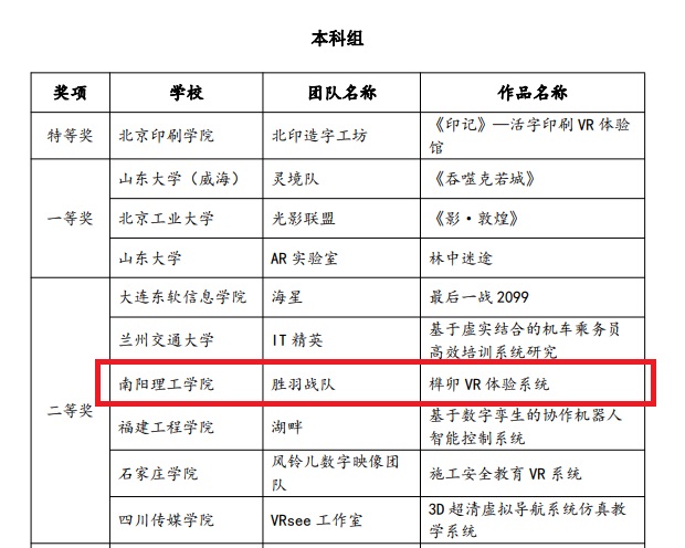 本网讯(特约记者/梁莹)2021年11月05日,第四届虚拟现实技术及应用创新大赛高校创新赛(IVRTC 2021)圆满落幕。我校数字媒体与艺术设计学院学生团队在决赛中表现优异,获得全国二等奖。