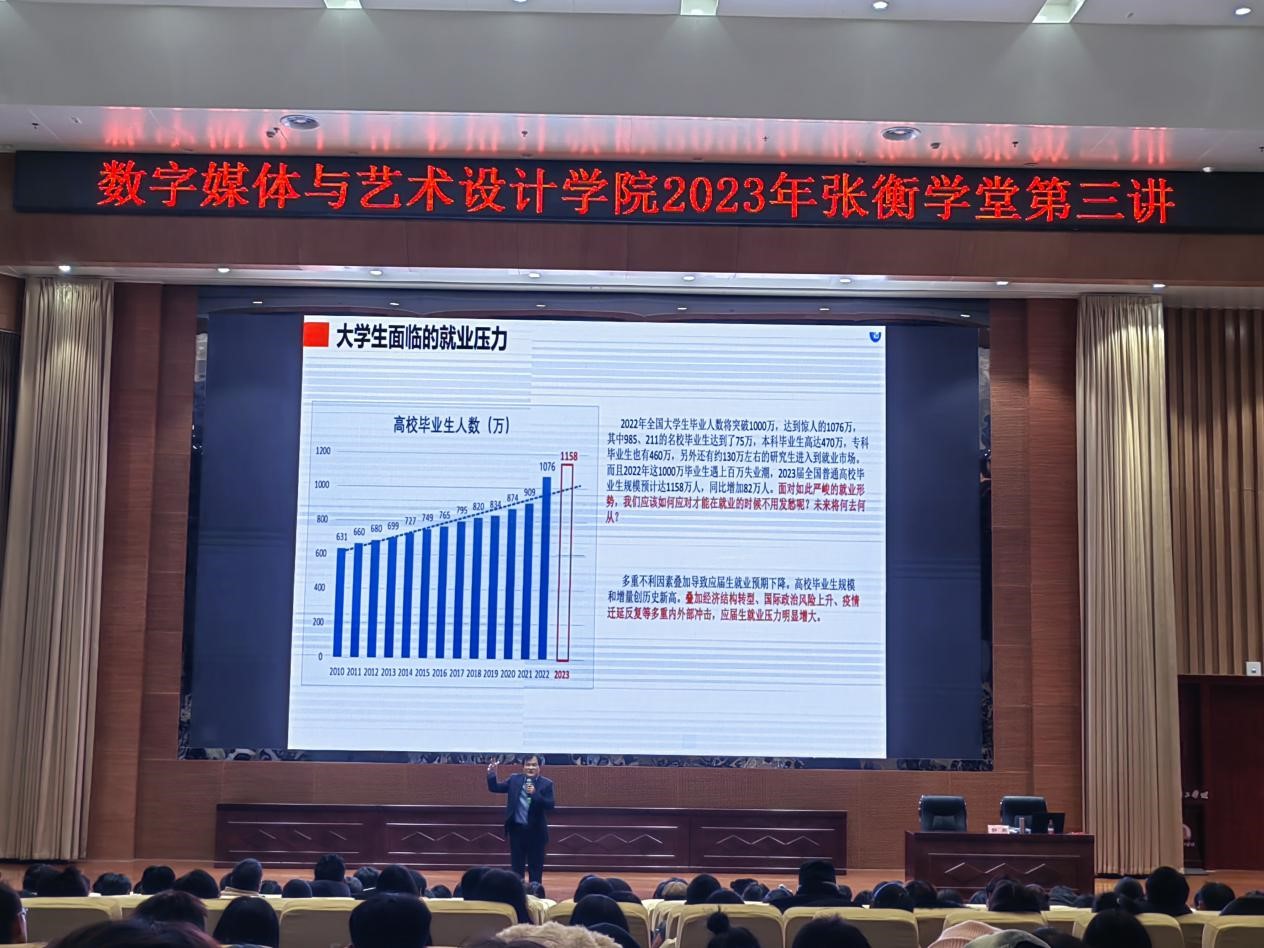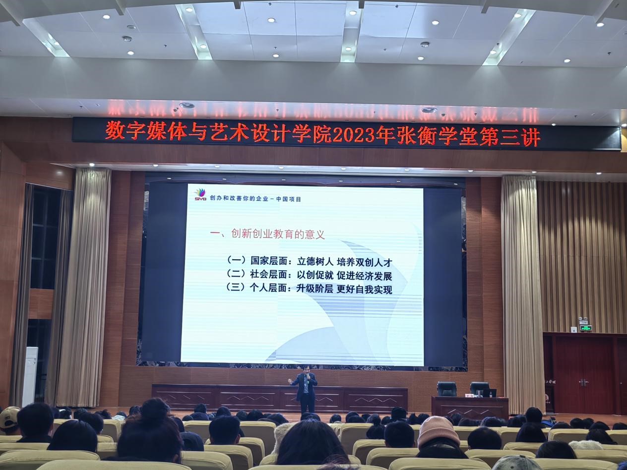 本网讯(特约记者/陈苗苗)为进一步推进双创育人工作,引导学生积极参加创新创业类竞赛。11月29日19点,数字媒体与艺术设计学院2023年“张衡学堂”第三讲在第三报告厅举行,邀请招生就业处郭勇老师担任主讲,2023级新生参加。