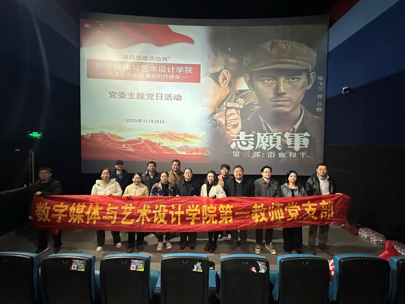2025年11月28日下午,“课程思政活动月”数字媒体与艺术设计学院第一教师党支部组织全体党员教师在华纳影城开展红色观影主题党日活动。此次观影活动作为一次意义深刻的主题党日活动,旨在深入传承红色基因、凝聚奋进力量。