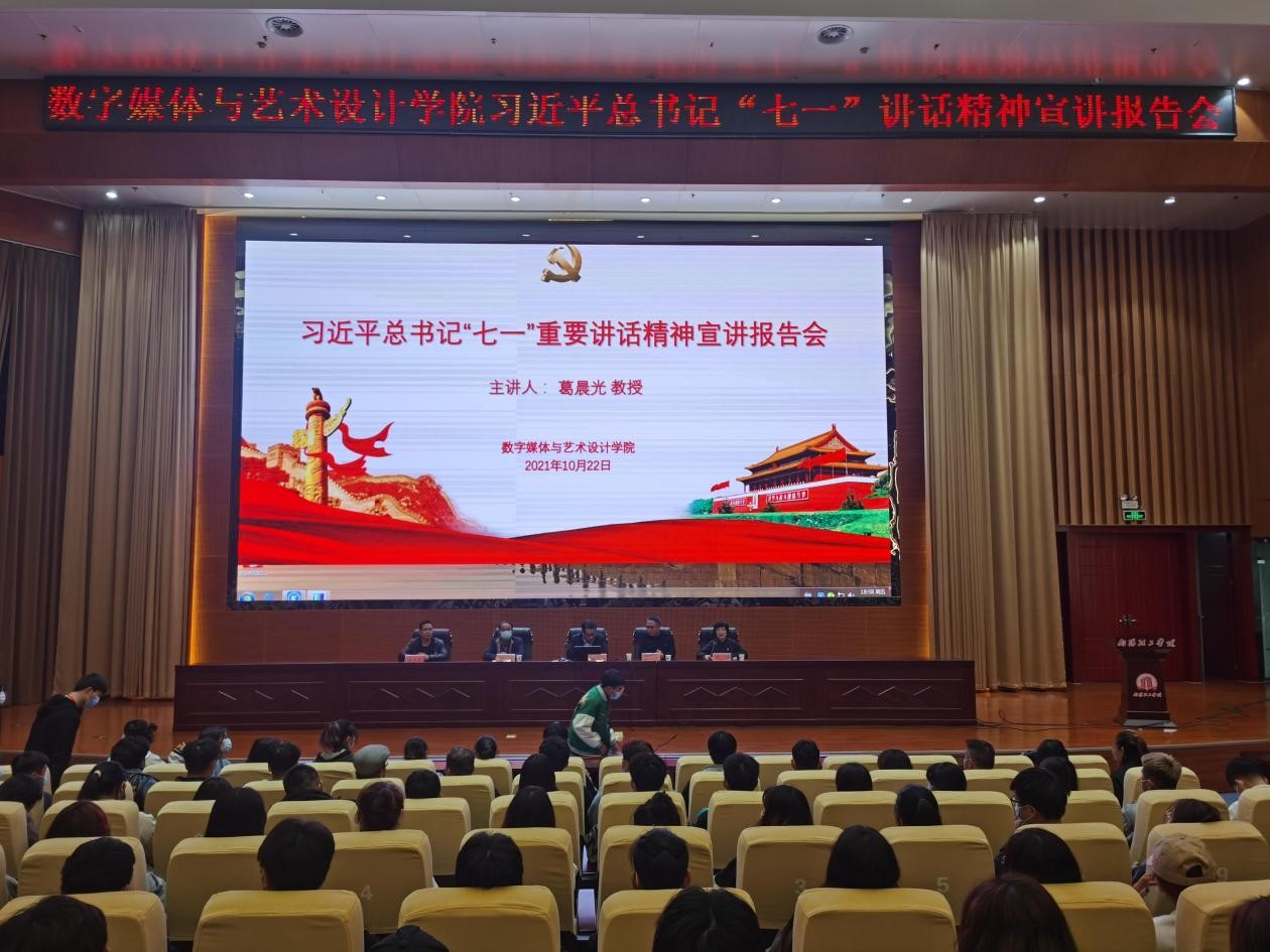 本网讯(特约记者/张睿)10月22日,校党委委员、副校长葛晨光在第三报告厅以《以史为鉴开创未来的政治宣言和行动纲领》为题为数字媒体与艺术设计学院师生宣讲习近平总书记“七一”重要讲话精神。学院全体教师、学生党员、青马学堂学员、2021年秋期分党校学员和全体2021级新生参加。