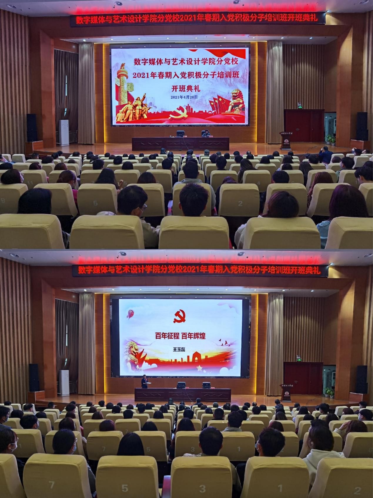 本网讯(特约记者/张睿)4月20日下午,校党委委员、副校长王玉磊在第三报告厅以《百年征程 百年辉煌》为题为数字媒体与艺术设计学院师生上专题党课,学院班子成员、全体教师、学生党员及2021年春期分党校入党积极分子等200余人参加。