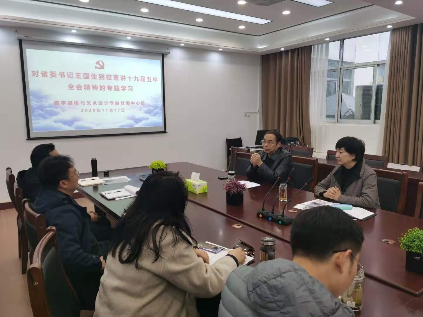 11月17日,数字媒体与艺术设计学院党委中心组在学院会议室集中学习省委书记王国生来校调研讲话精神。