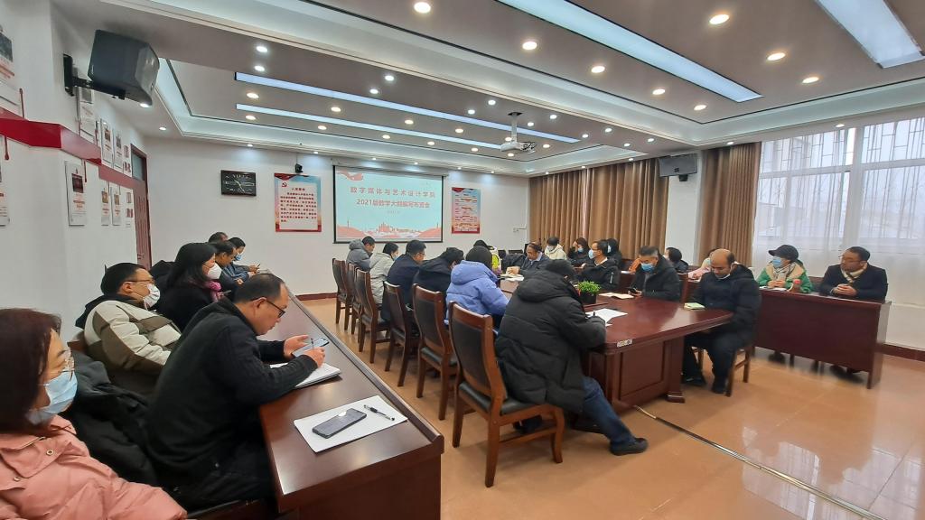 2022年1月12日上午,数字媒体与艺术设计学院在8号教学楼小会议室召开2021版课程教学大纲编写工作会。会议由院长薛庆吉主持,主管教学副院长、院教务办、专业负责人、教研室主任、视觉传达设计专业、动画专业、数字媒体技术专业和数字媒体艺术设计四个专业参与编写大纲骨干教师参与会议。