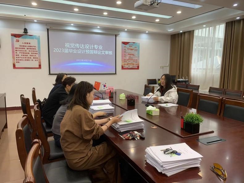2023年4月21日视觉传达设计教研室在8号楼二楼小会议室召开了2023届毕业设计(论文)预答辩会议,会议由教研室主任谢茜主持,骨干教师参加。
