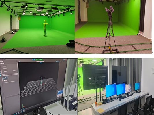 实验室现有影视级拍摄辅助绿箱设备79平、演播厅LED抠像灯光25个、光学动作捕捉相机22套、定位仪固定套件22套、VR头显套装3套、手势捕捉手套3套、面部表情捕捉设备1套;VR大空间运行系统3套、虚拟现实框架平台软件1套、VR全景影视软件1套等仪器设备。实训室使用光学式动作捕捉设备、高速摄像机追踪目标上的标记点来获取动作数据,搭配动作捕捉系统,可实时捕捉动作数据,细微到手指关节动作捕捉;方便后期在Unity3D、UE4、3D MAX、Maya、blender、MotionBuilder等软件中进行处理。