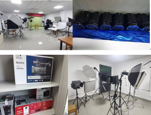 主要配置相机4台、摄像机11台、LED摄影补光灯4套、闪光灯4套、大号顶灯架2套、电动背影轴1套、三脚架3套等设备,拥有室内人像摄影;静物、产品、服装、模型等商业摄影;后期合成影视素材拍摄等功能。