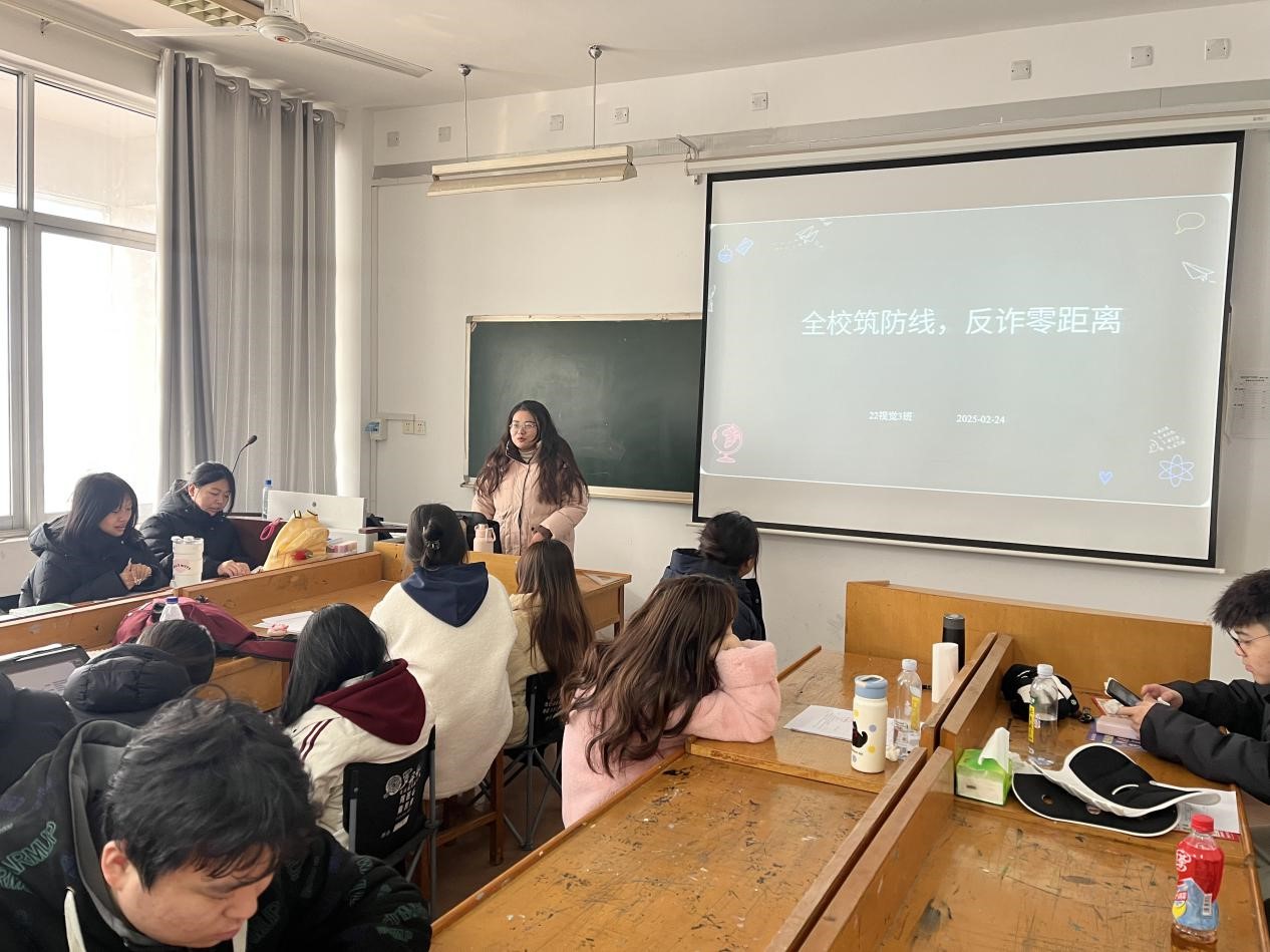本网讯(记者/陈苗苗 学生记者/冯可鑫)为进一步增强同学们的防诈骗意识,提高自我保护能力,维护校园安全稳定,2025年2月23日19点,数字媒体与艺术设计学院在各班固定教室开展防诈骗安全教育班会。学院书记、副书记、团学办主任、辅导员及学业导师亲自参加,全院学生参与。