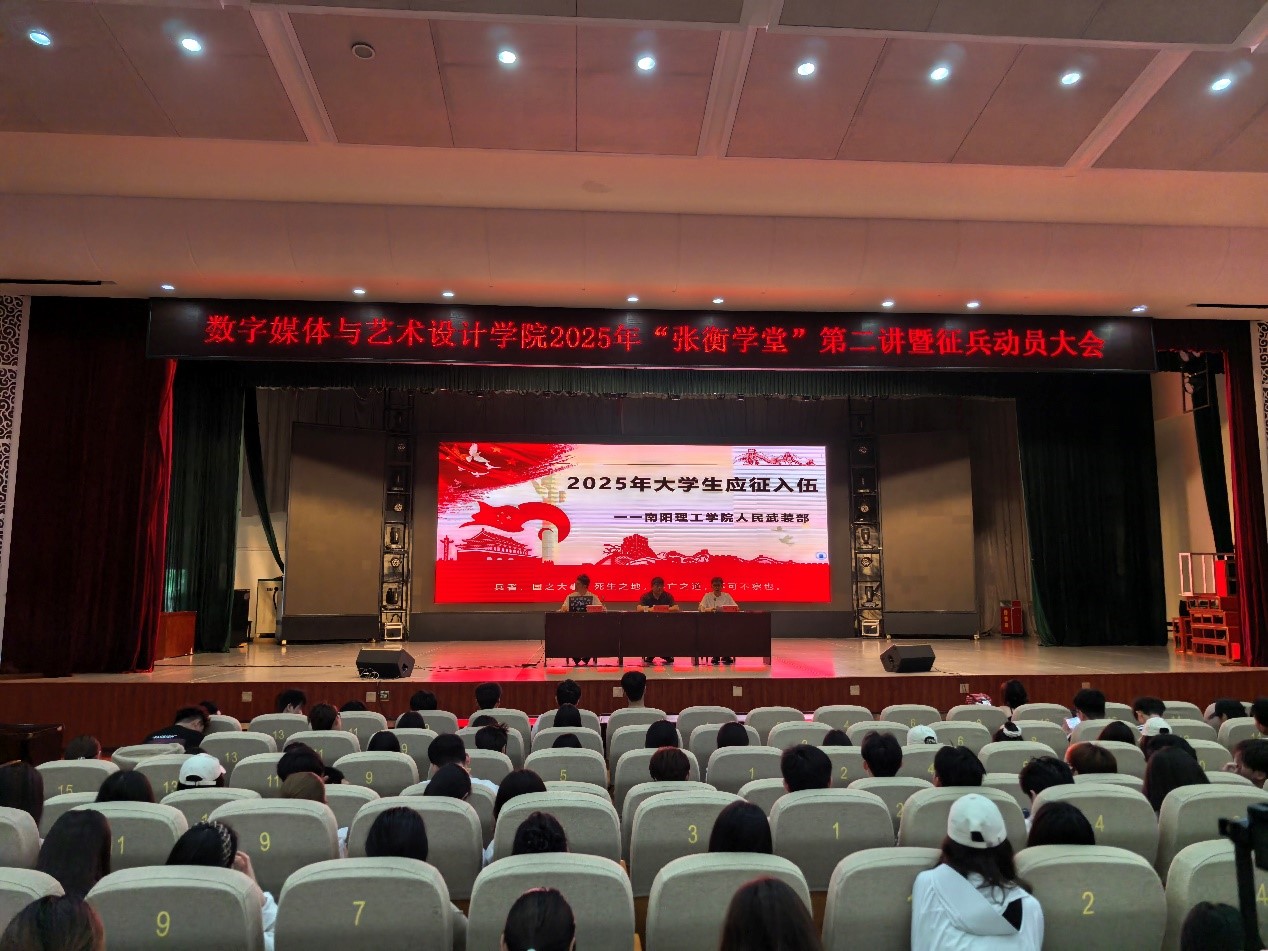 2025年5月14日下午,数字媒体与艺术设计学院2025年“张衡学堂”第二讲暨征兵动员大会在毕业大厅举行。校武装部老师、学院部分教师代表、全体辅导员及600余名学生参加。