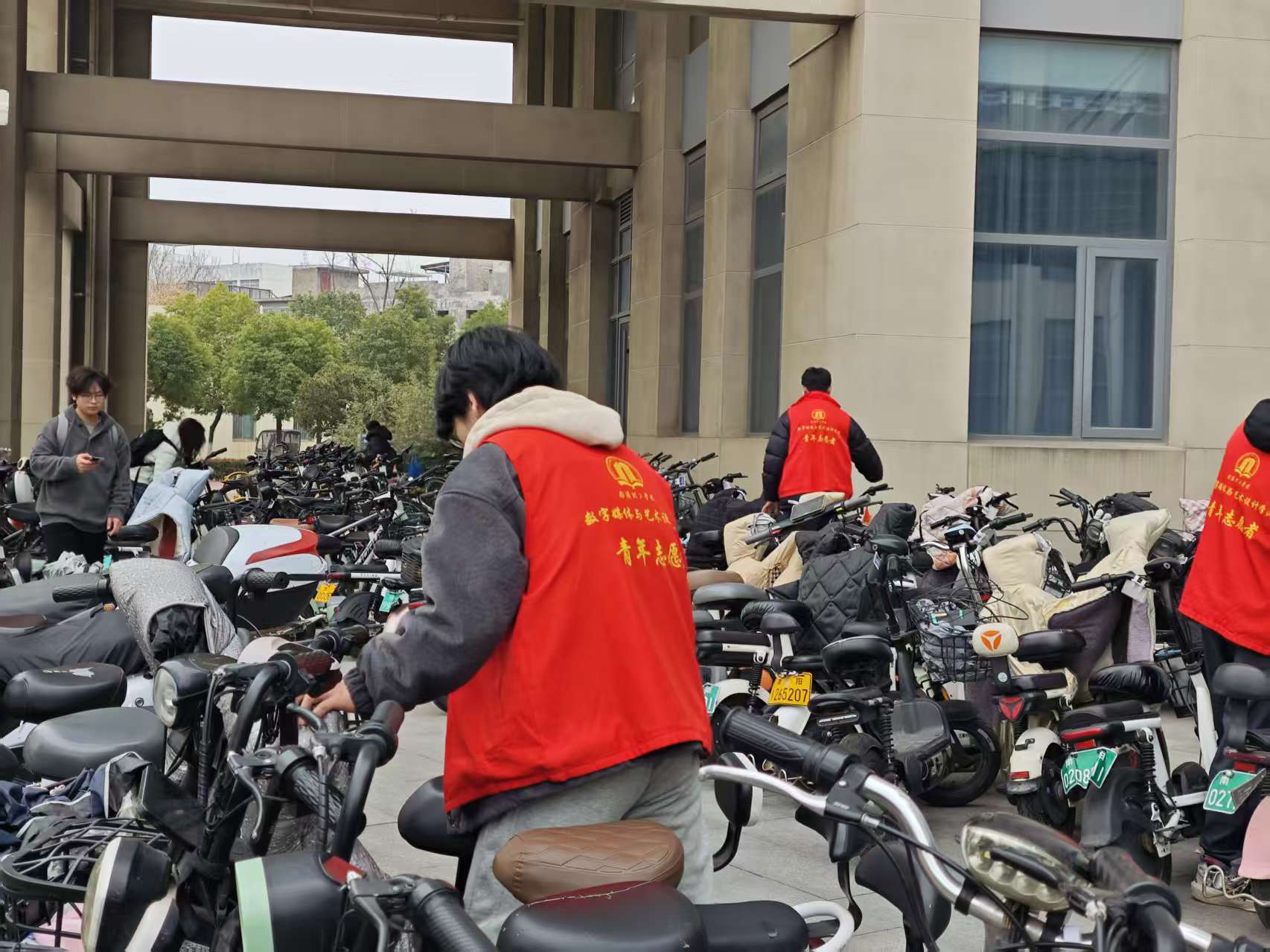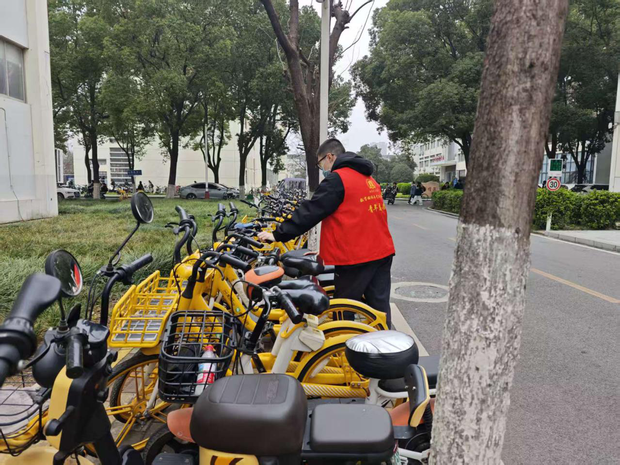 活动现场,志愿者大家将乱停乱放的车辆逐一搬运至划定停车区域内,对齐摆放、规范车向,同时对过往停车、取车的师生进行文明引导,提醒大家自觉遵守停车规范。志愿者们分工协作、耐心细致,有效消除了因车辆拥堵带来的安全隐患,让校园道路恢复整洁畅通。