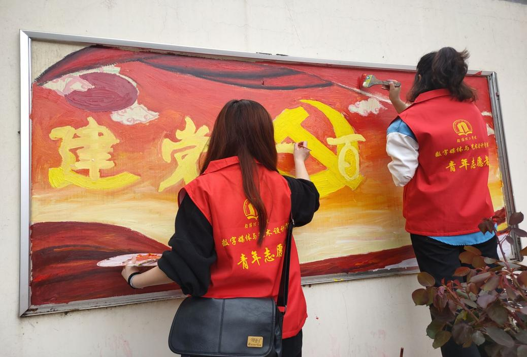 本网讯(记者/雷霞 学生记者/刘鹏程 汪凯月)为喜迎建党一百周年,3月27日,我院数十名雷锋连学生志愿者前往位于独山大道南段的赵营村,开展“青蔓乡间”专项活动。志愿者们与赵营社区综合文化服务中心负责人详细沟通之后,在其文化广场上的宣传栏墙面上绘制了一幅红色情意满满的建党百周年纪念画。