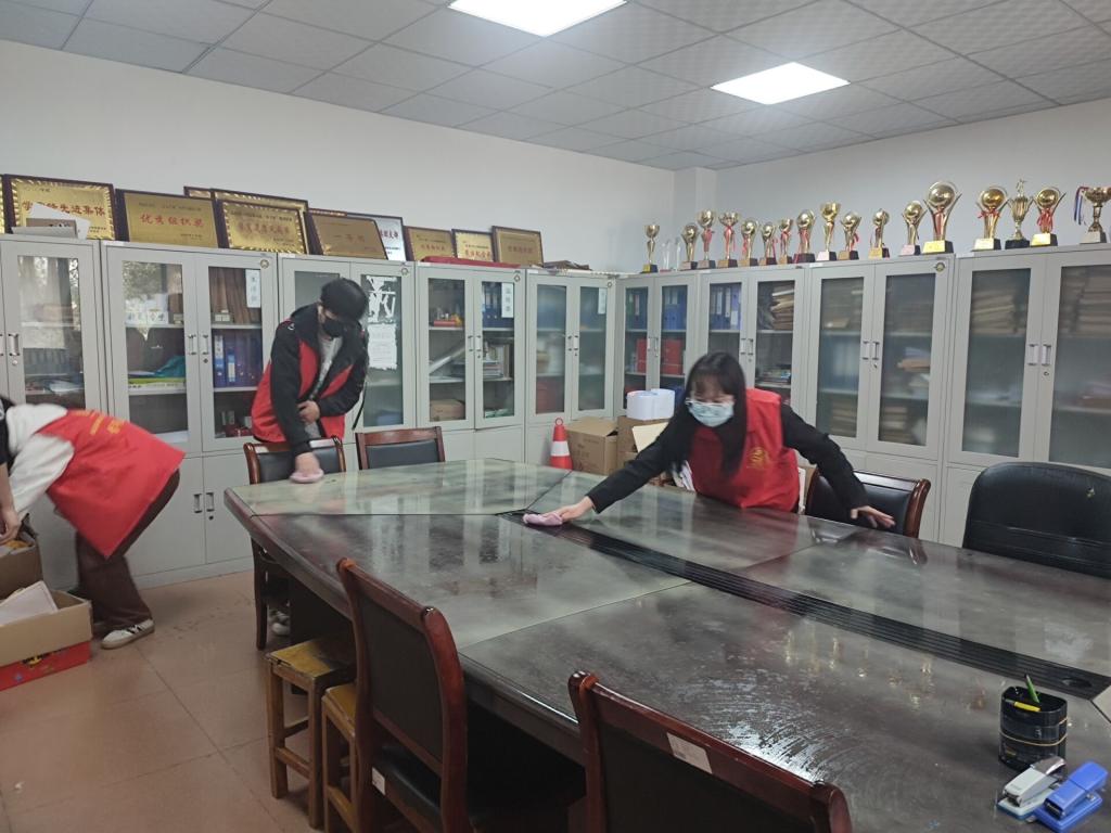 活动过程中,同学们认真仔细的进行清扫,展现了志愿者们阳光向上,精神饱满的良好状态。扫地、擦桌子、擦柜子、拖地、倒垃圾、整理文档,每个环节都有条不紊、配合默契,让凌乱的办公桌焕然一新、几净明亮。