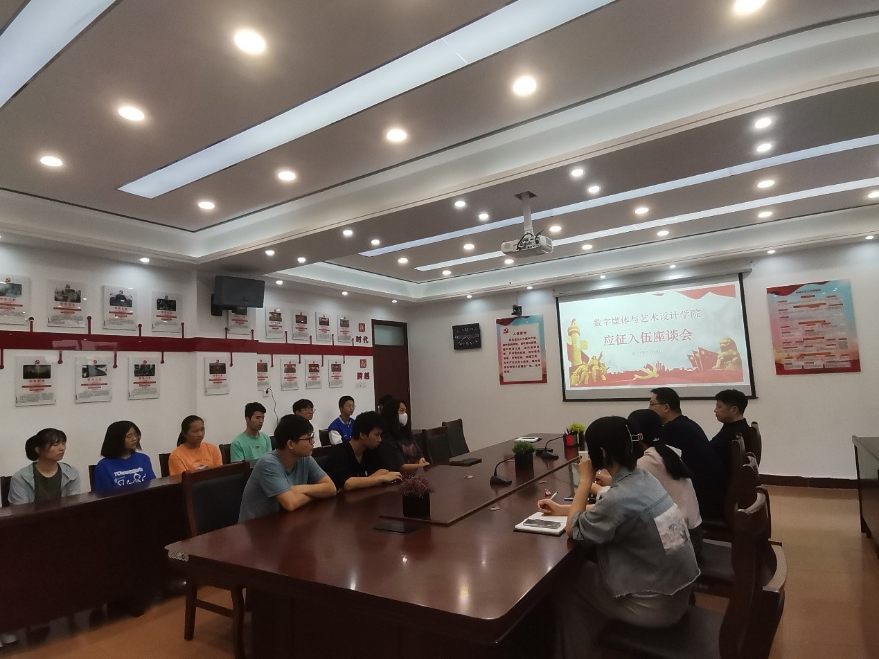 5月20日下午,数字媒体与艺术设计学院召开大学生应征入伍座谈会,邀请学校武装部相关老师讲解入伍流程和入伍政策,全体辅导员、意向应征入伍的学生和部分毕业生参会。