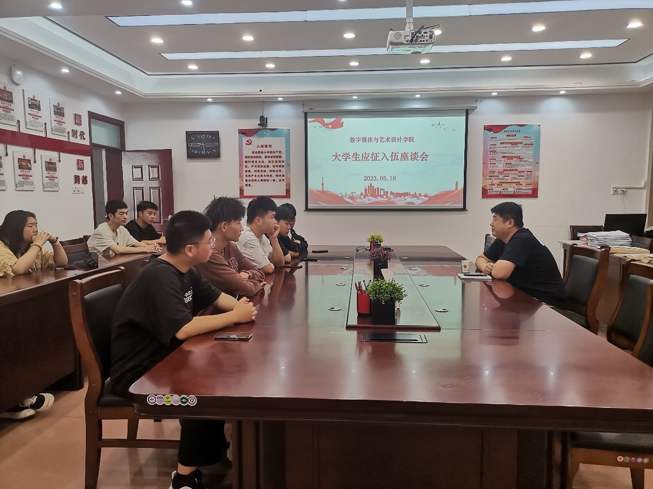 为增强大学生国防意识,激发参军报国热情,深入贯彻习近平强军思想,进一步落实国家相关征兵工作要求,2023年5月18日上午,数字媒体与艺术设计学院特邀请学校武装部周密老师在八教二楼小会议室召开大学生应征入伍座谈会。