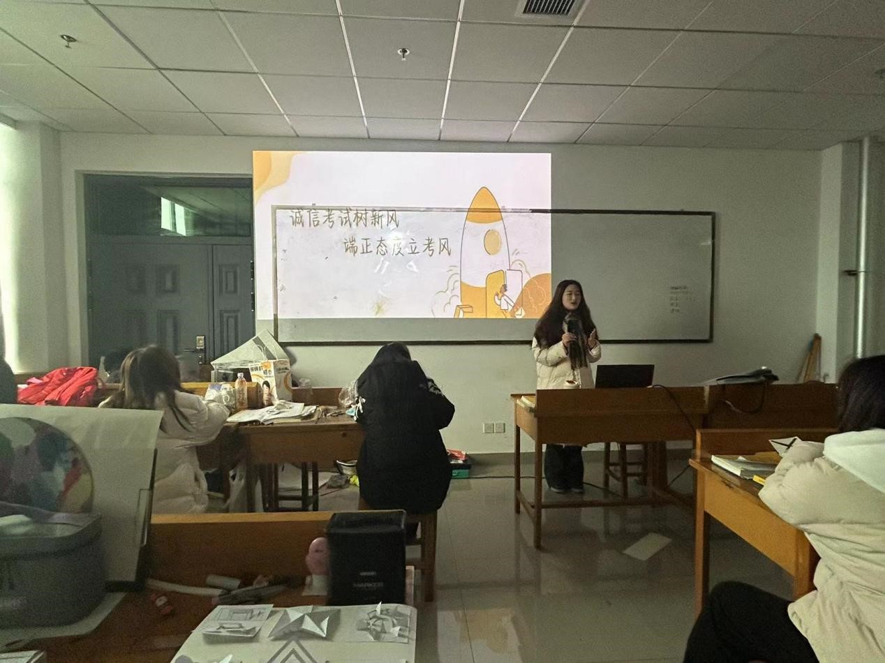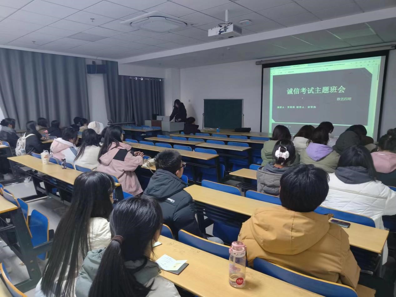 为推进学院学风建设,进一步端正考风、严肃考纪,营造文明诚信的良好考风,2023年12月25日-29日,数字媒体与艺术设计学院各年级在各班固定教室组织开展诚信考试主题班会。
