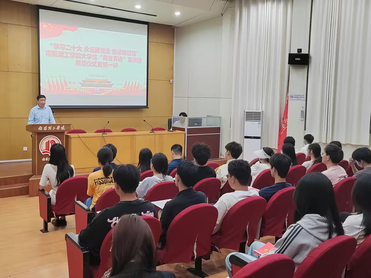 本网讯(记者/陈苗苗 学生记者/岳新萍)为深入学习贯彻习近平新时代中国特色社会主义思想,引领广大青年坚定跟党走、建功新时代,为实现中华民族伟大复兴的中国梦凝聚起强大青春力量。我院青马学堂全体学员于5月15日19点在中込会馆报告厅参加南阳理工学院大学生“青言青语”宣讲团启动仪式暨“学习党的二十大精神 永远跟党走 奋进新征程”主题宣讲第一讲。