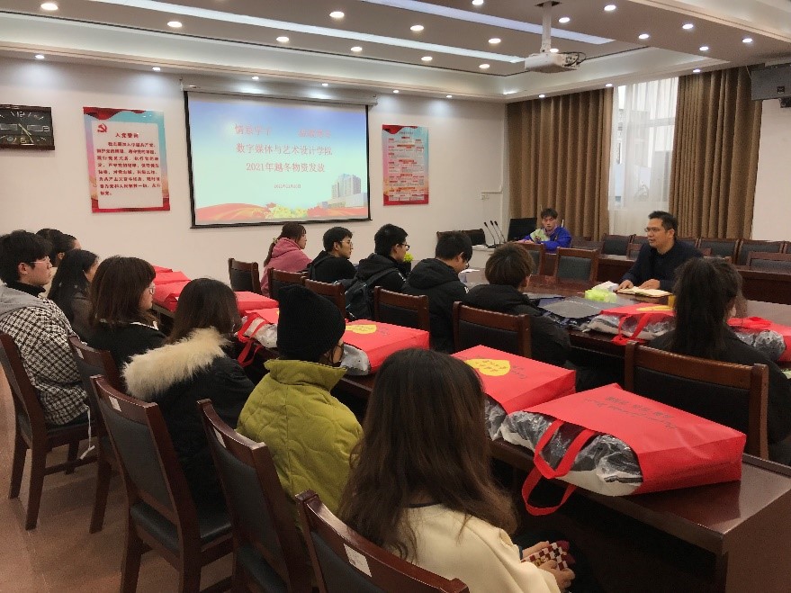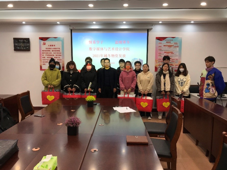2021年11月26日,数字媒体与艺术设计学院在8教2楼小会议室进行“情系学子,温暖寒冬”——2021年越冬物资发放,学院党委副书记汤中科、资助专干老师和21级部分家庭经济困难学生参加。