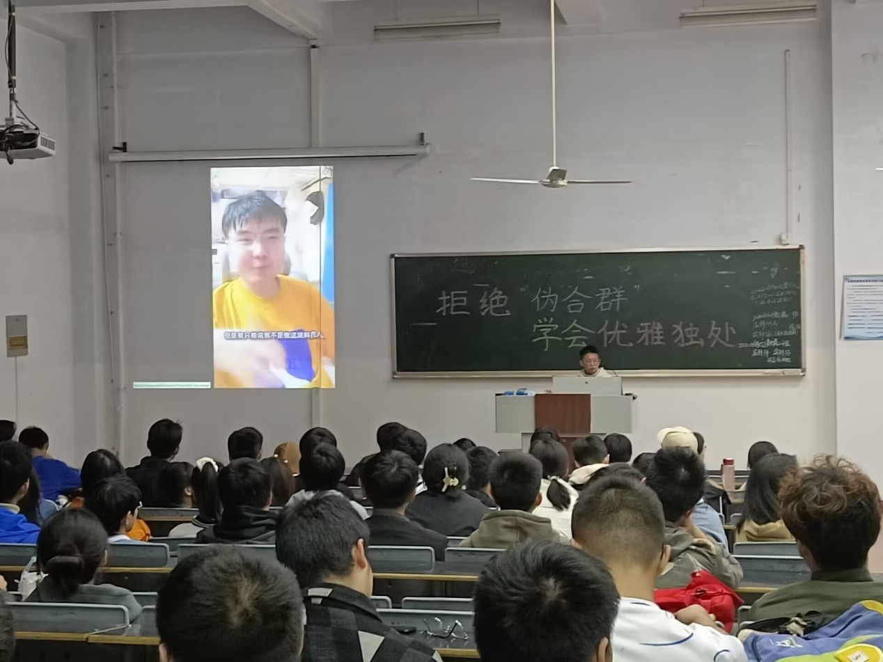 本网讯(记者/雷霞 学生记者/王心怡)进入大学,我们离开父母的庇护来到一个陌生的环境,为了避免孤独,越来越多的人迫使自己与他人合群。为切实加强大学生心理健康教育,我院于2022年10月30日在八教一楼阶梯教室举行了“拒绝伪合群,学会优雅独处”主题班会活动。