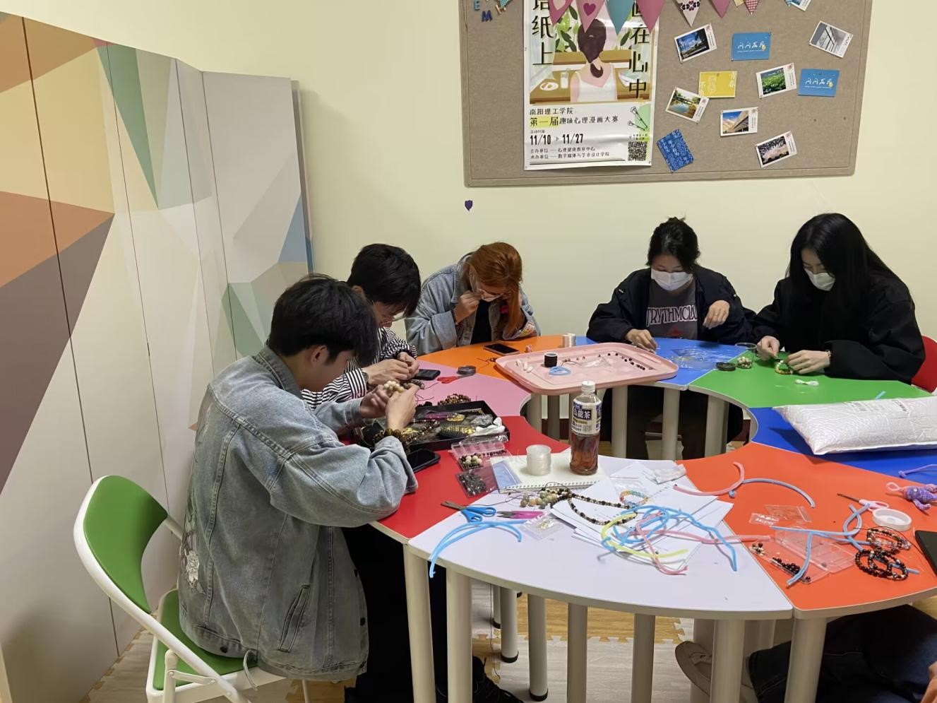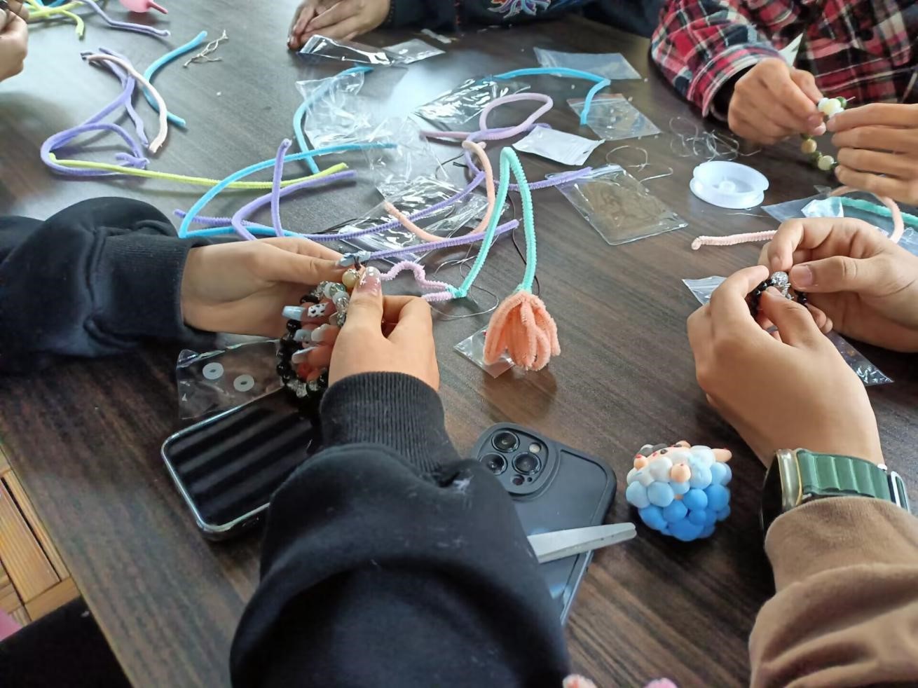 活动以制作手链和手工制品为主,同学们在自由选择所需要的手工材料之后,便可独立制作或者几人共同完成手工制品。期间同学们精神饱满,尽情发挥自己的想象力和创造力,用五颜六色的珠子串成美丽的手链,充分展现了数艺学院莘莘学子的文化风采与积极进取的精神面貌。